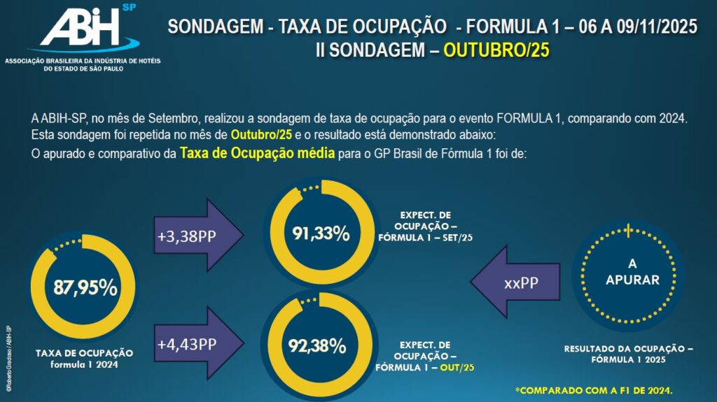 A repetição da sondagem do GP Brasil de Fórmula 1, realizada em outubro, mostrou avanço significativo na expectativa de ocupação para o período de 6 a 9 de novembro. A previsão atualizada aponta 96,91% de ocupação, crescimento de +8,97 pontos percentuais em relação ao resultado de 2024.