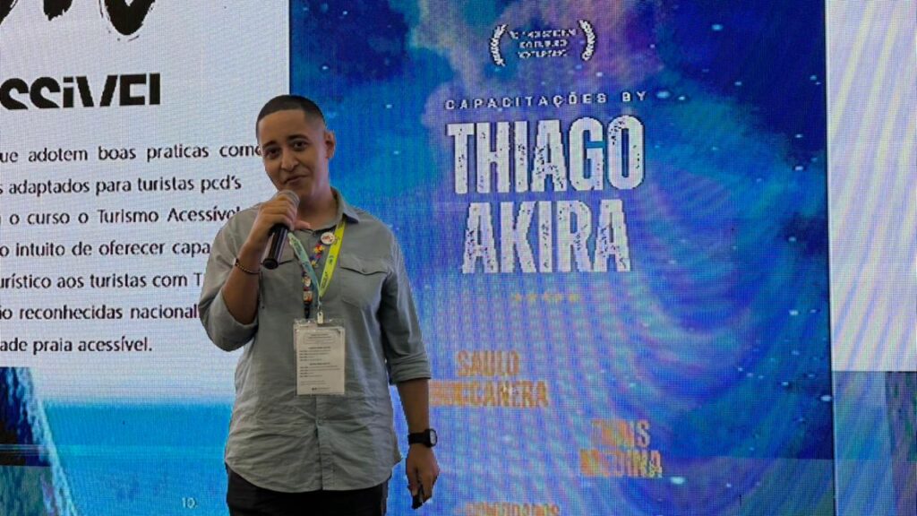 O tema foi abordado pelo palestrante Dudu Rodrigues, graduado em Turismo e especialista em turismo inclusivo. Ele, que é autista de nível 1 de suporte, usa suas próprias experiências para propor soluções e fomentar o debate sobre acessibilidade. Durante sua apresentação, Dudu destacou que a inclusão no turismo começa pela compreensão das particularidades de cada viajante. “Quem tem deficiência sente o mundo de um jeito diferente. O turismo precisa entender isso e criar experiências sensoriais que mexam com a imaginação”, afirmou. Para ilustrar essa questão, ele convidou o público a fechar os olhos e imaginar uma praia paradisíaca, descrevendo a textura da areia, o som das ondas e o cheiro do mar, como forma de mostrar que o turismo inclusivo também se constrói por meio das sensações.